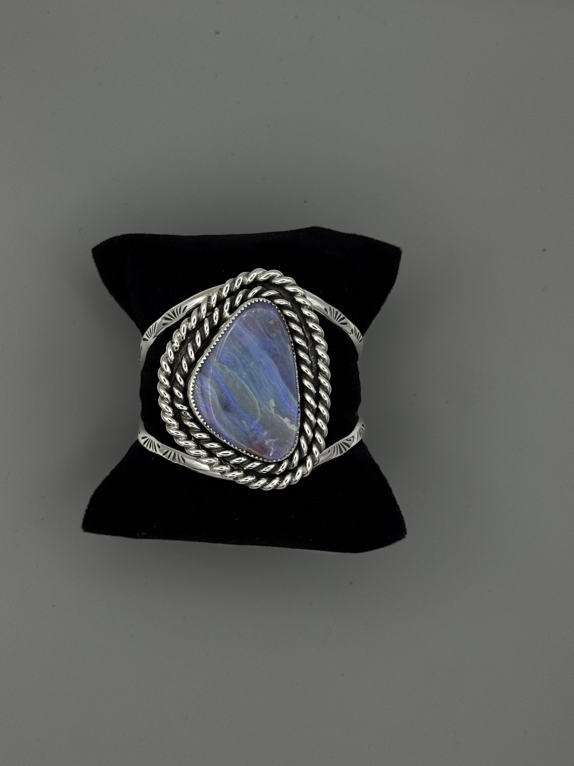 large natural australian opal accented by a double heavy twist border and on a handmade double shank cuff. Slightly adjustable. Fits size small to medium wrist.