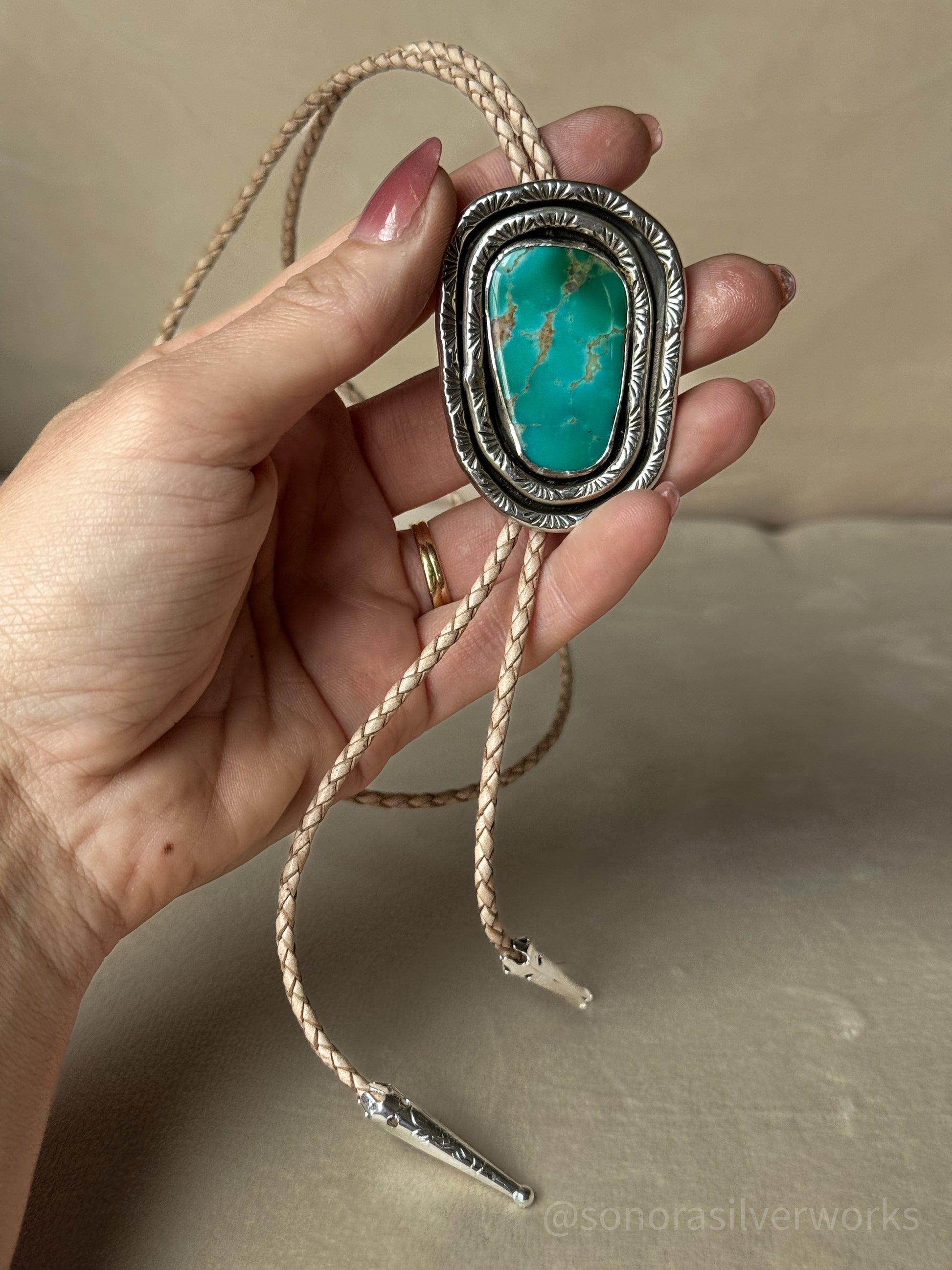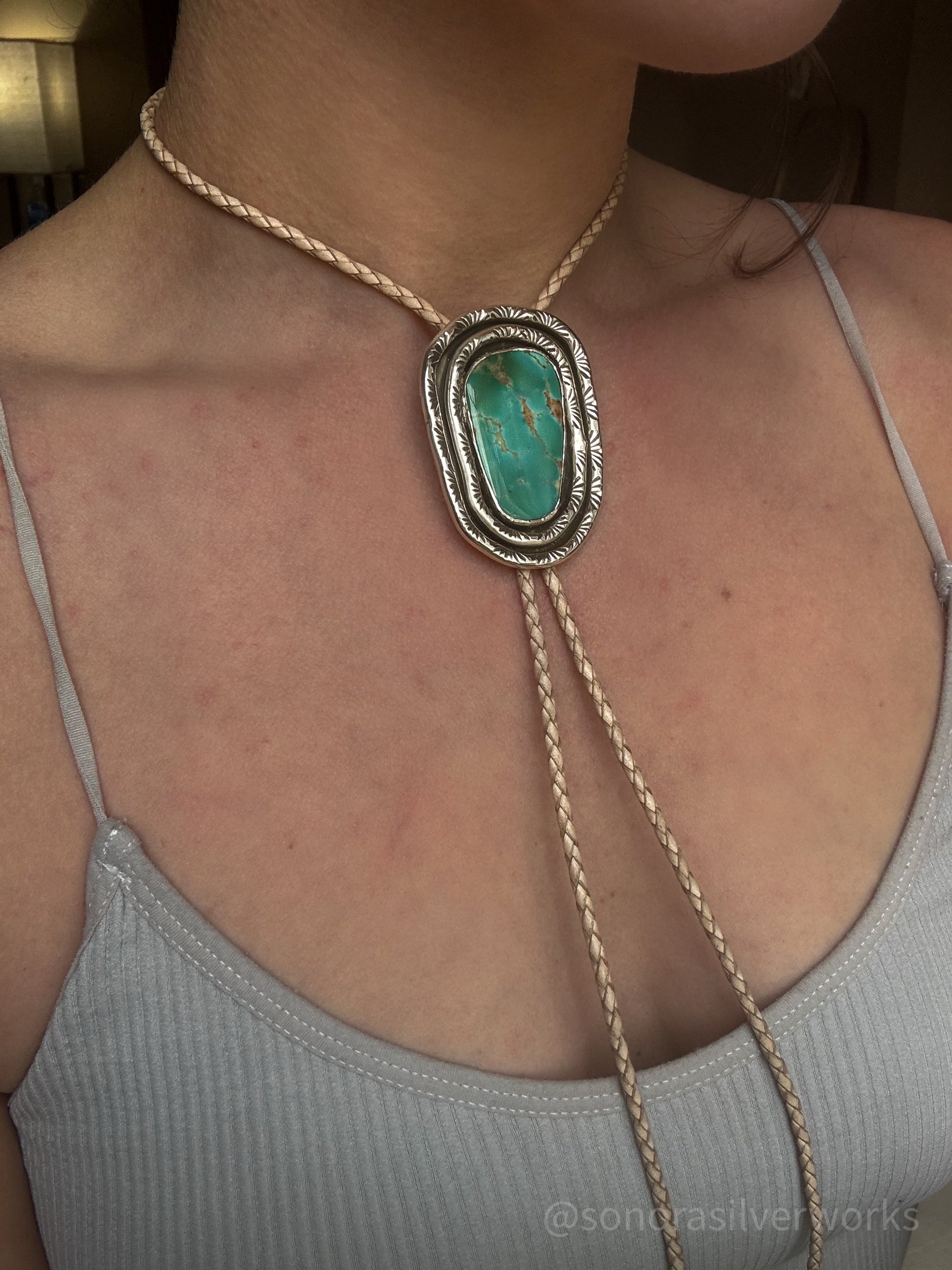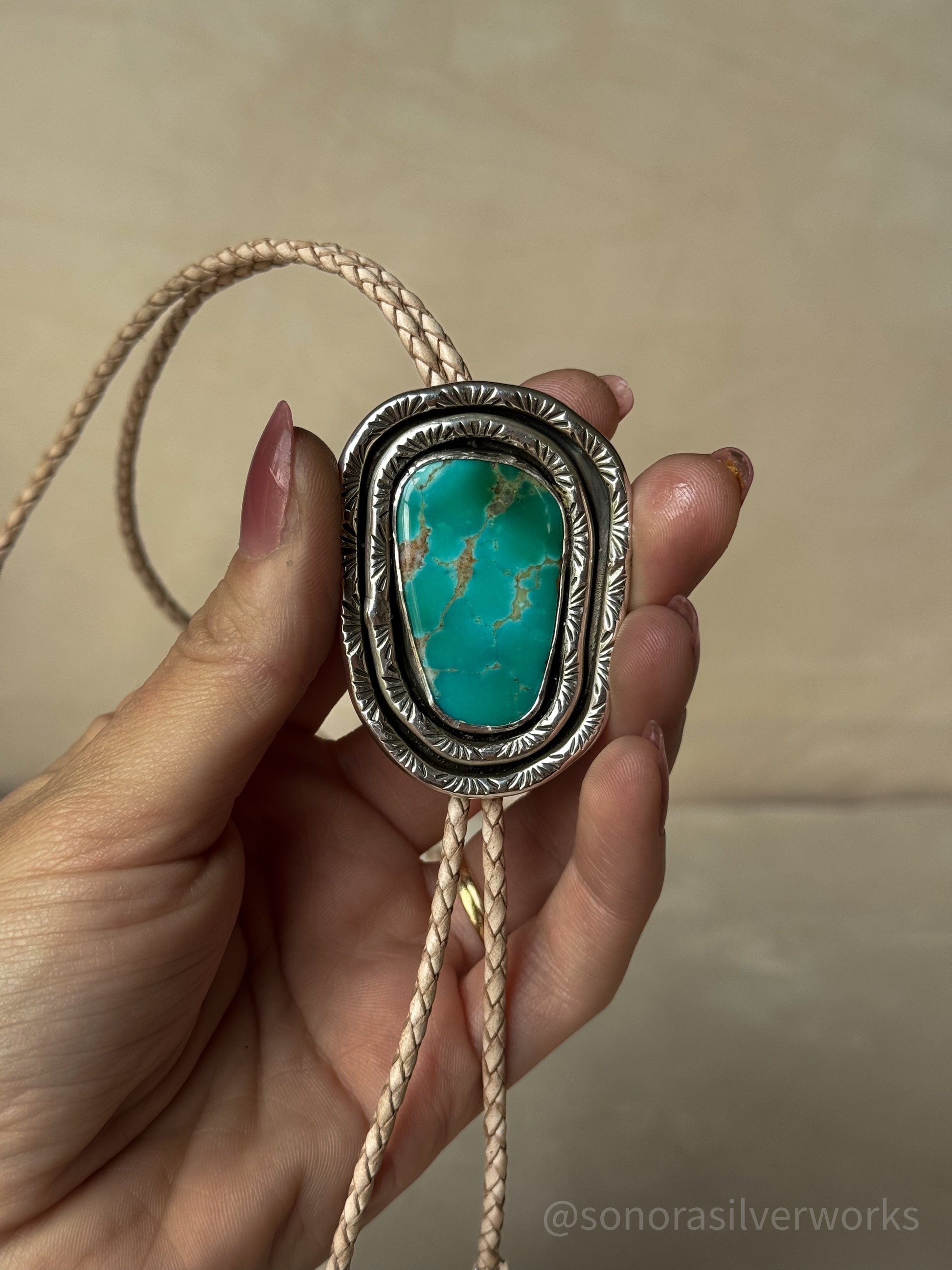 Beautiful cut of Royston turquoise bordered with a double handstamped heavy gauge wire. Handmade bolo clasp on reverse with makers mark stamp and silver purity. On a tan leather bolo cord.