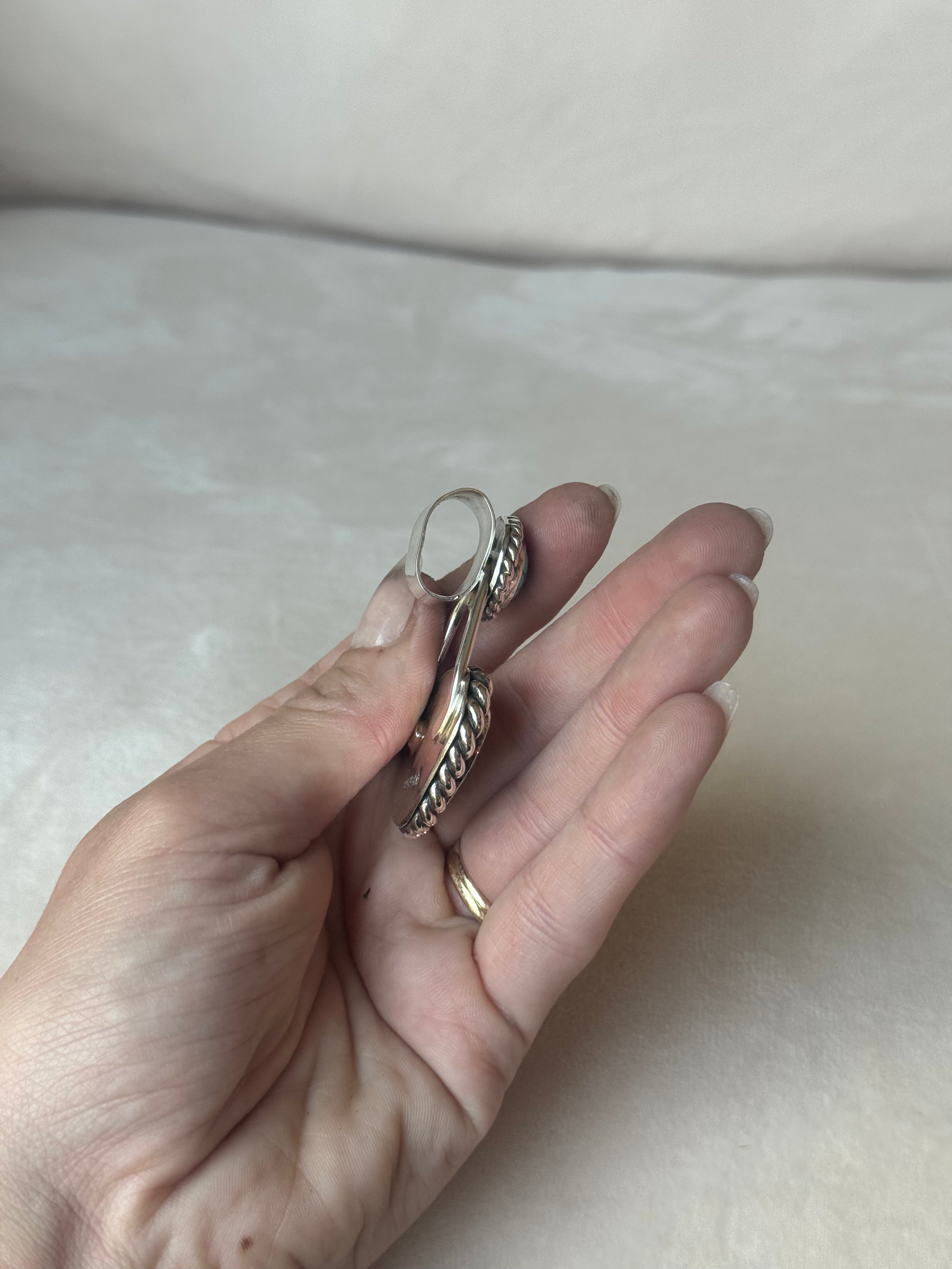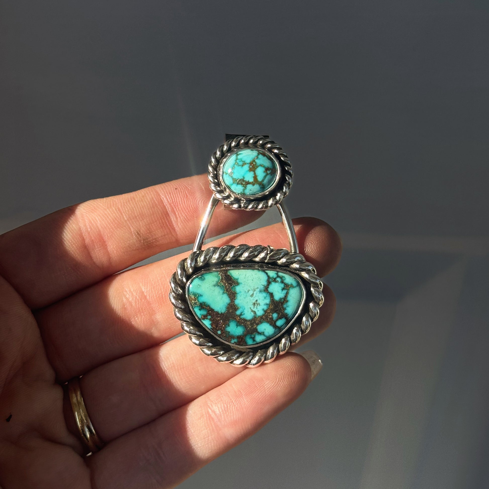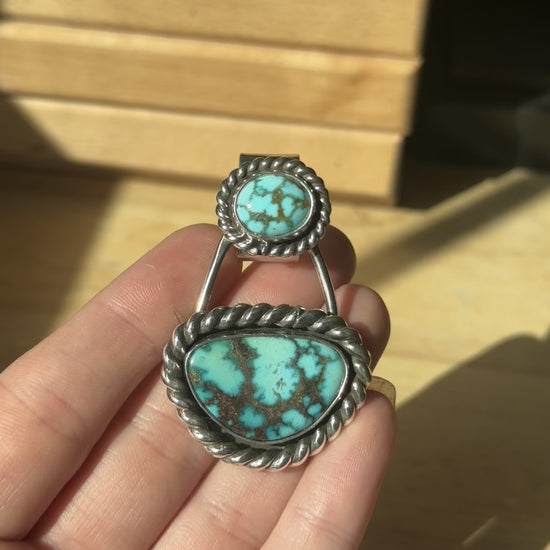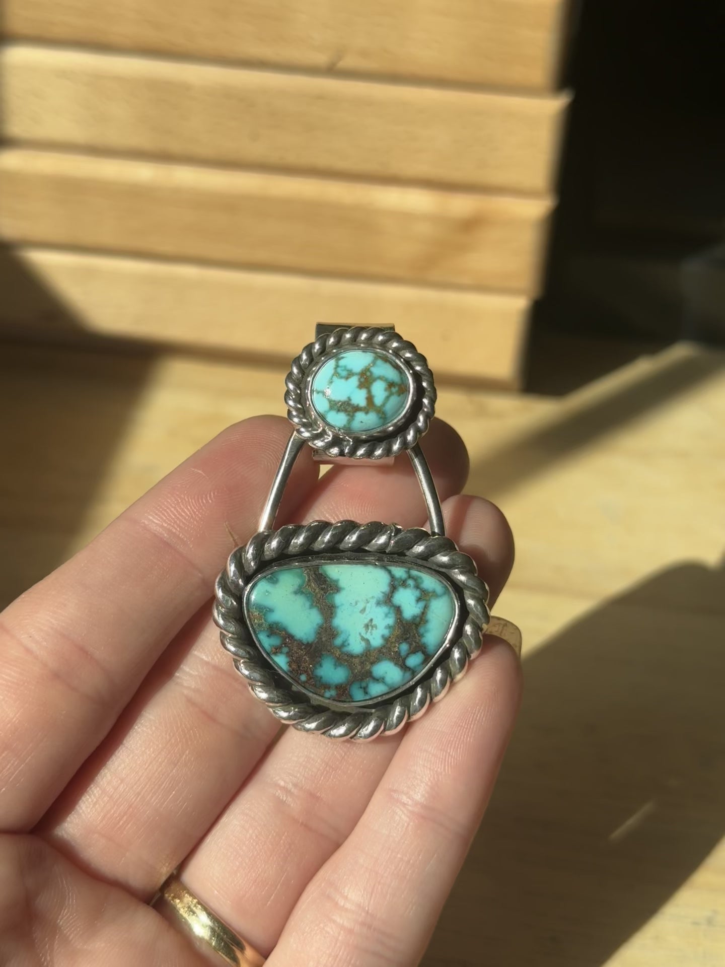 Beautiful mix of high grade Cloud Mountain and Sierra Bella turquoise accented with a heavy twist border and made with a bail ideal for use on an 8mm Omega chain necklace. stamped with makers mark “sonora”