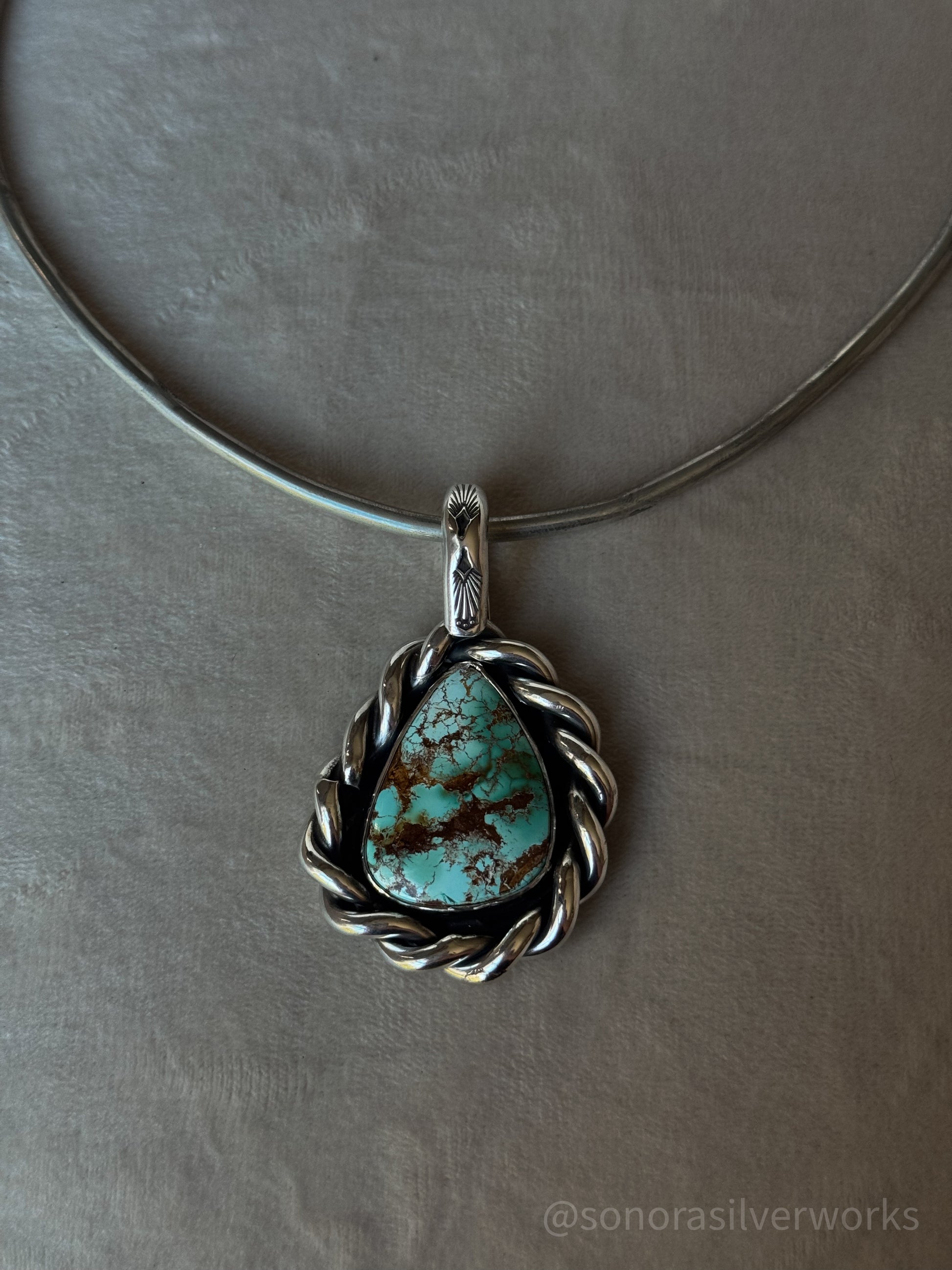 Beautiful large cut of high grade Royston turquoise in a handmade heavy twist rope border and on a handstamped bail measuring approximately 10mm. Perfect for collectors of high grade cuts