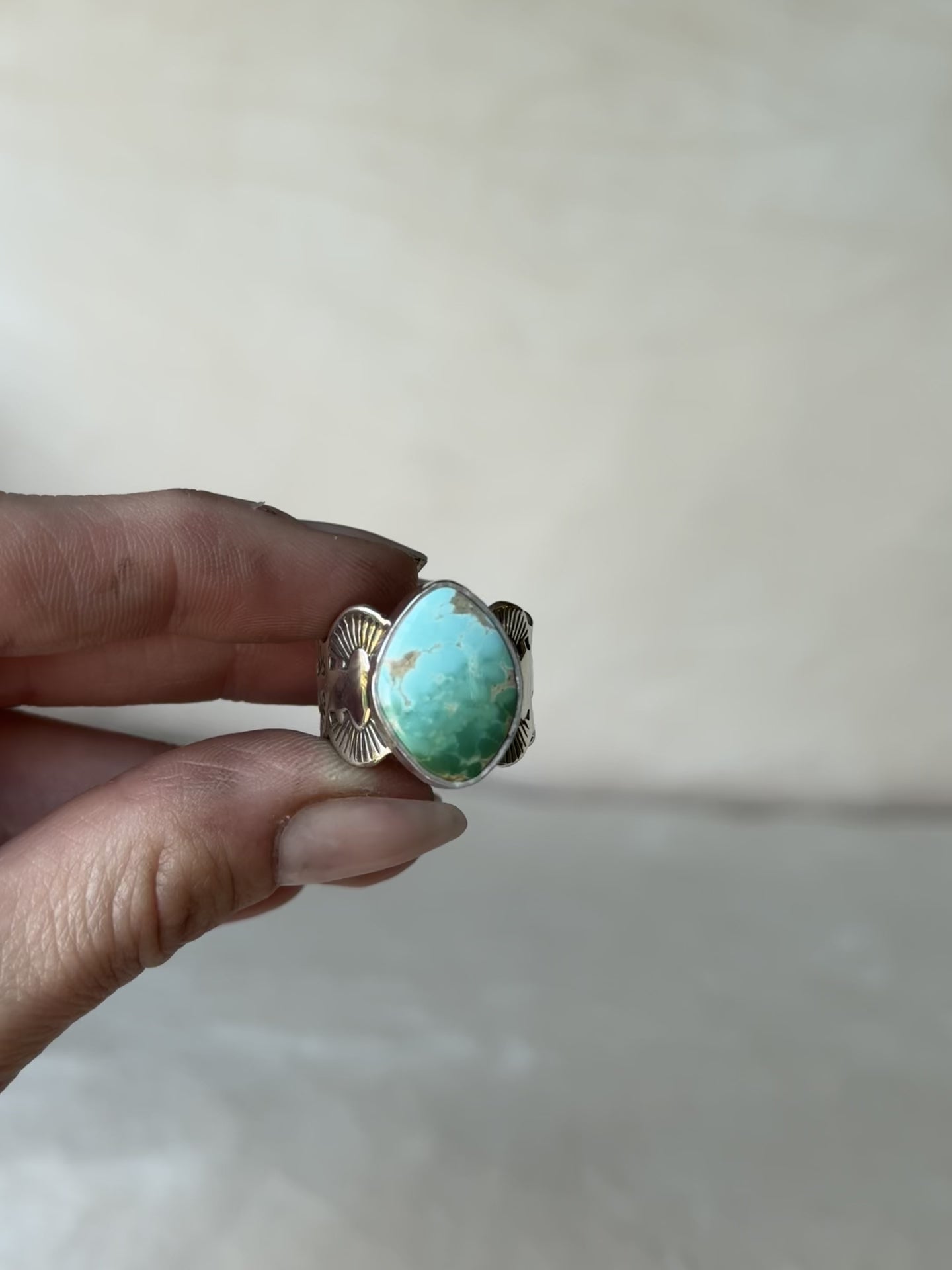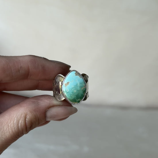 Crafted from high-grade Royston turquoise and solid sterling silver, this wide band ring showcases a high quality cut. The band is handstamped and scalloped, with a stamped silver purity mark. Available in size 9.25.