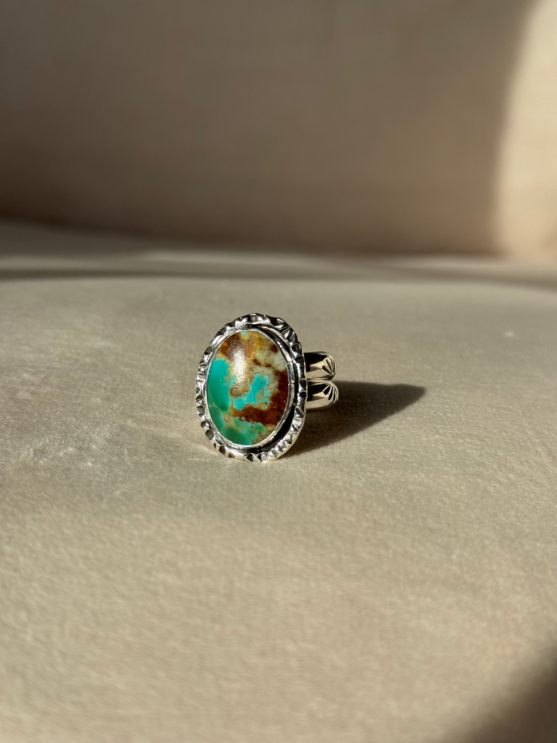 Kingman hardy pit turquoise set in solid sterling silver. On a heavy gauge double handstamped band in size 9.5.