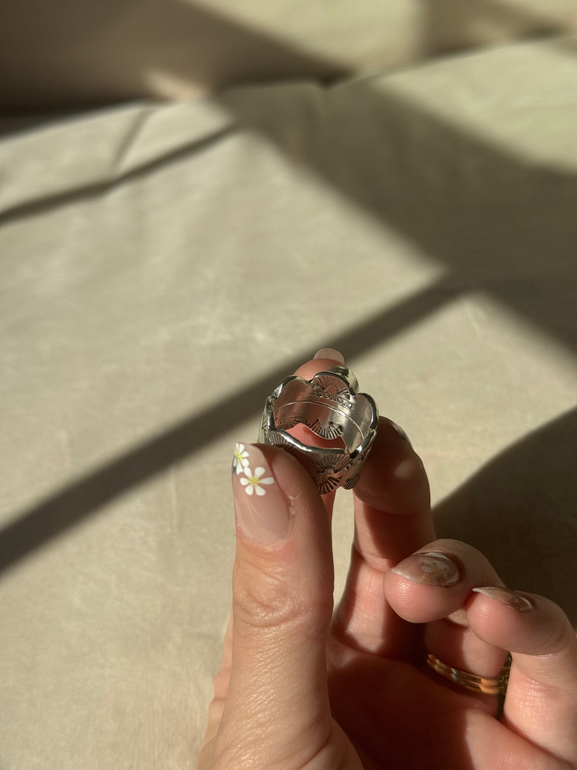 Beautiful sky blue Lone Mtn turquoise with striking matrix set in solid sterling silver. On a hand stamped thick gauge scalloped wide band ring in size 8.5. Stamped with makers mark “sonora”