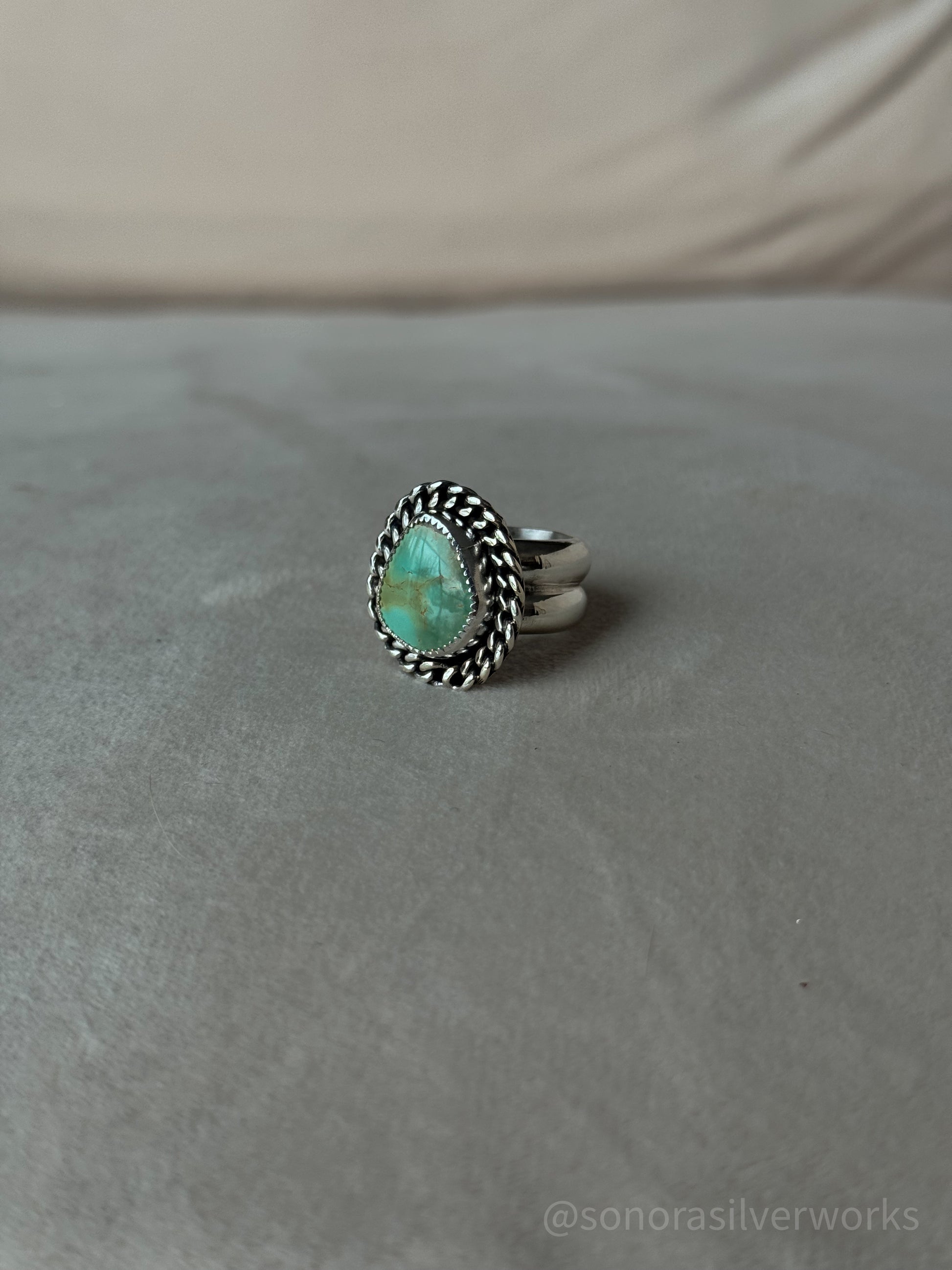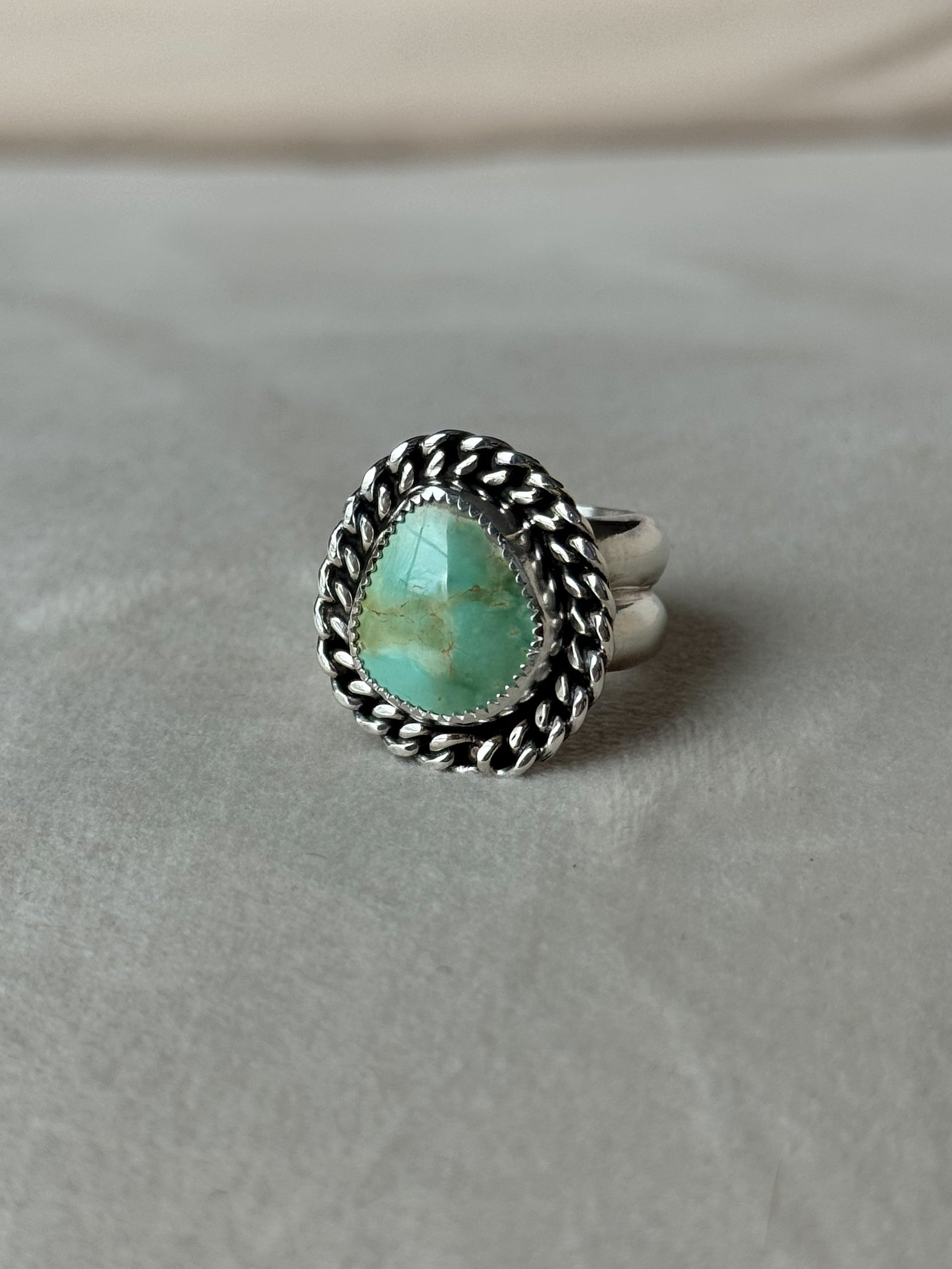 Royston turquoise set in solid sterling silver and accented with a sterling silver curb chain border. On a handmade heavy gauge double band in size 5.25. stamped with makers mark and silver purity.